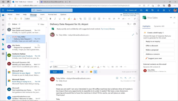 其次,將SalesONE與AI結(jié)合,幫助銷售團(tuán)隊(duì)快速回應(yīng)客戶的詢問,提供產(chǎn)品信息、報(bào)價(jià)等信息,實(shí)現(xiàn)輕松銷售跟進(jìn);銷售跟進(jìn)過(guò)程中通過(guò)outlook、teams等與客戶互動(dòng)時(shí),快速生成郵件內(nèi)容,會(huì)議紀(jì)錄、整理并進(jìn)行摘要總結(jié);對(duì)銷售跟進(jìn)與訂單交付數(shù)據(jù)進(jìn)行分析,并進(jìn)行異常預(yù)警。
