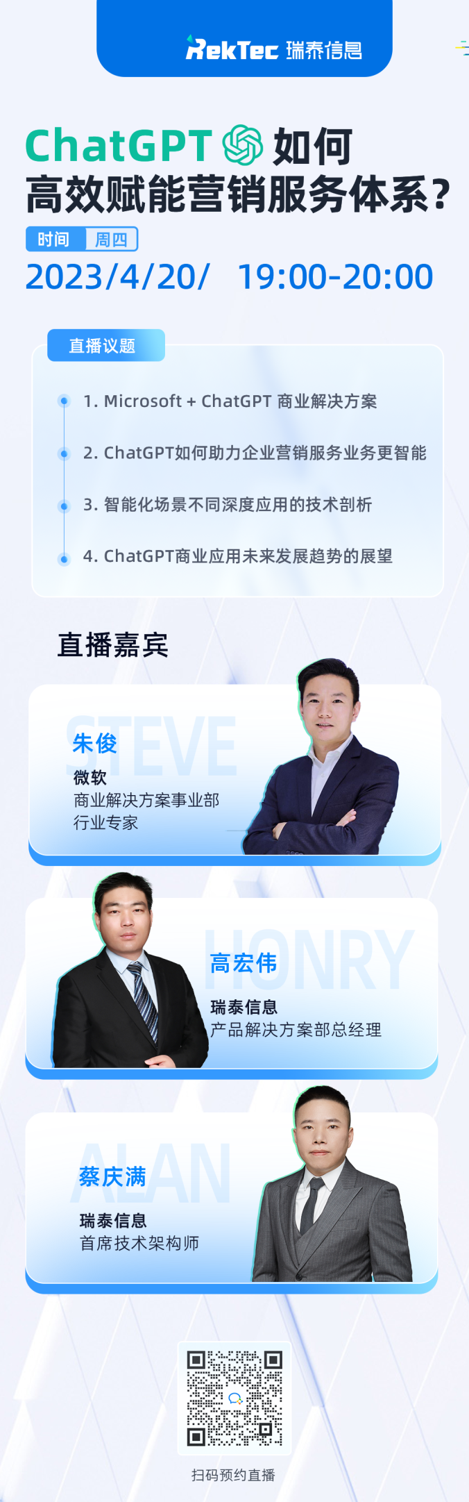 4月20日19:00-20:00,小瑞學苑邀請到微軟商業(yè)解決方案事業(yè)部行業(yè)專家朱俊、瑞泰信息產品解決方案部總經理高宏偉、瑞泰信息首席技術架構師蔡慶滿,為大家?guī)碇黝}為“ChatGPT如何高效賦能營銷服務體系”的主題分享。