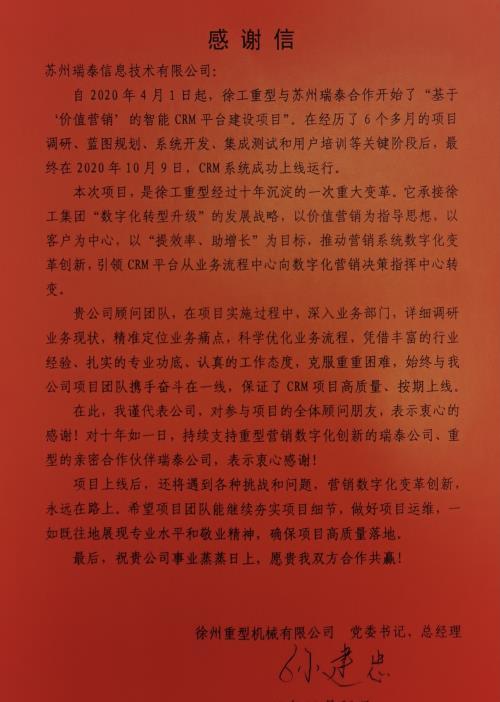 就在近日,瑞泰信息收到了徐州重型機(jī)械有限公司(以下簡稱:徐工重型)的感謝信,感謝瑞泰信息以專業(yè)水平和敬業(yè)精神,助力徐工重型客戶關(guān)系管理系統(tǒng)(CRM)項目成功上線運(yùn)行!